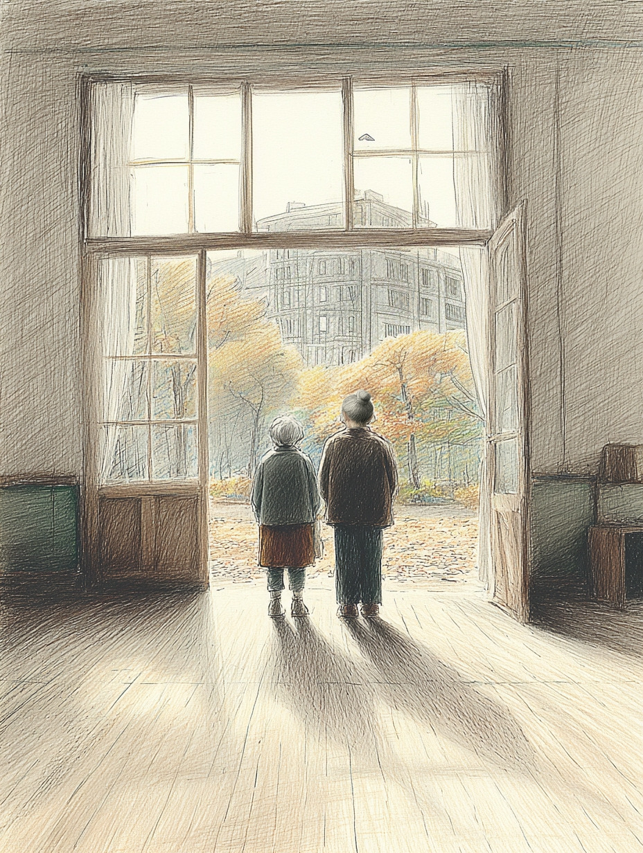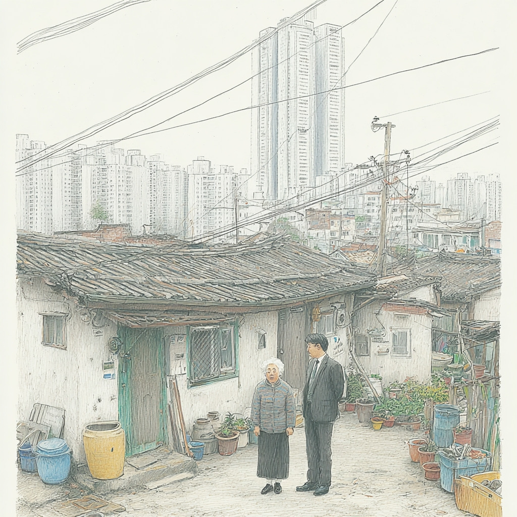 창문 너머로 햇살이 스며들었다. 재개발 바람에 다시 흔들리는 동네, 그 속에서도 여전히 꿋꿋이 서 있는 두 여인의 그림자가 강당 바닥에 나란히 드리워졌다.