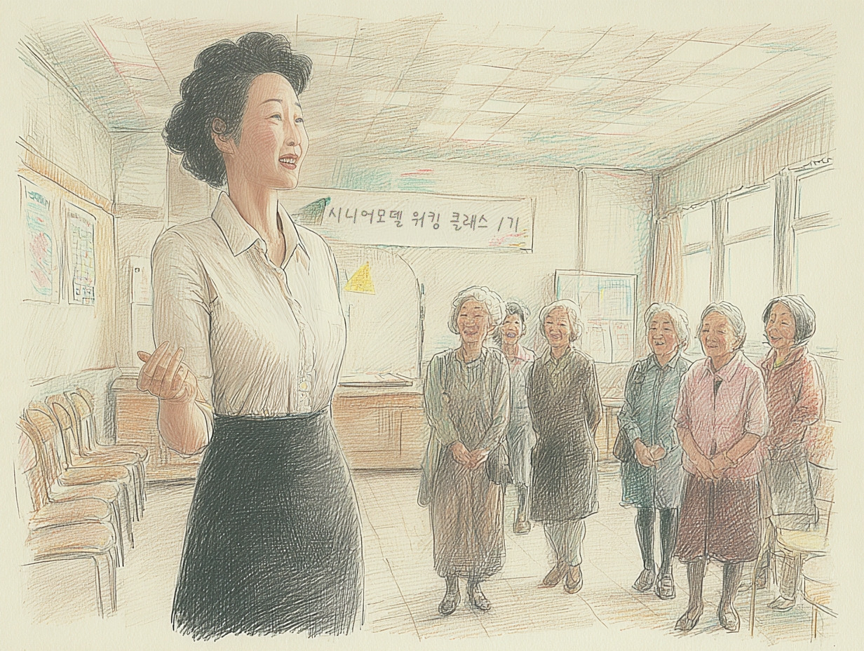 “어머님들, 오늘은 런웨이보다 더 어려운 걸 해볼 거예요. 서로 마주 보면서, 눈을 똑바로 바라보고 걸으시는 거예요. 자존심과 자부심을 눈빛으로 보여주셔야 해요. 그러면서도 가장 자신 있는 인자함이 드러나게!”