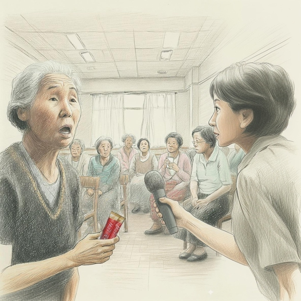 문이 열리자 기자 몇 명이 우르르 몰려 들어왔다. 마이크가 할머니들 앞으로 들이밀어졌다.