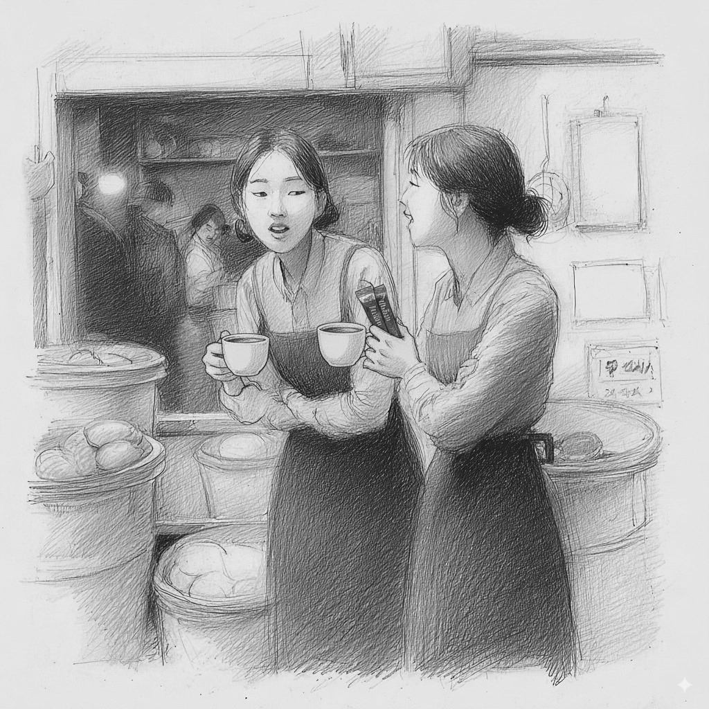 “이 맛이 최고지. 공장에서 야근하고, 시장서 장사하고... 힘들 때마다 이거 한 잔이면 하루가 돌아가는 거 아뇨. 뭐, 원두? 우리 세상엔 그런 거 없었지.”