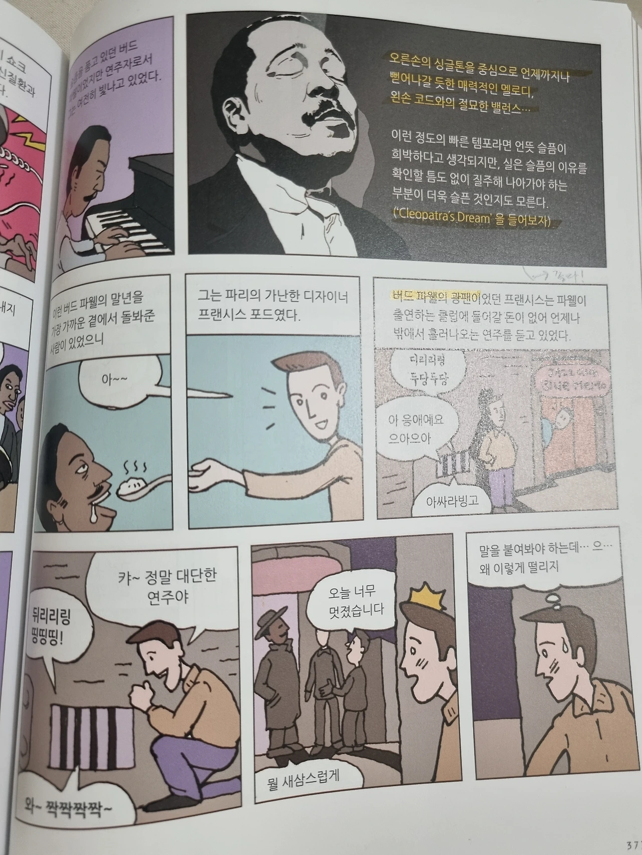 많은 재즈 연주자들의 스토리와 음악들이 소개되어 있는데 저는 이 책을 기획하고 그린 남무성 작가님이 재즈를 얼마나 사랑했는지를 글을 읽으면 읽을수록 알 수 있었습니다. 재즈 연주자들을 나무위키에서 검색하며 찾아 읽어봤는데 책과의 느낌과 사뭇 달랐습니다. 작가님이 재즈 연주자들의 인생을 얼마나 애정 어린 시선으로 바라보고 있는지, 재즈의 문턱을 낮추고자 독자에게 얼마나 쉽게 설명하려고 했는지. 깊이 감동했습니다.