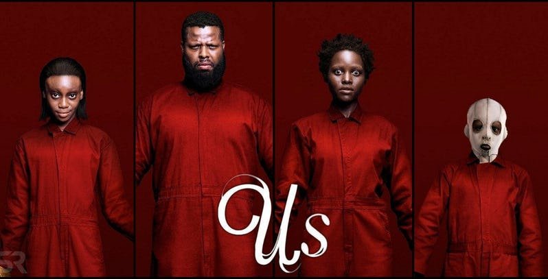 그렇다. 이 영화는 제목에서도 알 수 있듯이 우리, US 미국 사회에 대한 이야기다. 감독이 설정한 세계관은 지상에 사는 사람과 별개로 대륙 지하에 또 커다란 터널이 존재하고 이곳에 사는 사람들은 지상에 있는 인간들과 똑같은 모습을 하고 그들과 같은 운명을 가진 채로 갇혀 살아가고 있다는 것이다. 더 세부적으로는 인간복제의 실패작들을 지하 터널에 몰아넣어 방치했다는 설정인데 여기서 지상과 지하 두 세계, 같은 운명과 확연히 다른 두개의 삶을 보여주면서 미국의 이중성을 이야기하고 있다. 미국이 자유의 상징국가가되어 차별 없는 사회를 이상으로 두고 있지만 동시에 모순적으로 땅을 강탈하고 원주민들 내쫓았던 어두운 과거와 함께 인종과 빈부를 바탕으로 여러 가지 차별이 일어나고 있는 것은 누구나 아는 사실이다. 미국 정부 스스로도 이 문제점에 대해 알고 있음에도 묵인하고 그저 화려한 모습만을 강조한다는 점에서 그들의 이중성을 확인할 수 있다. 영화 속 뜨거운 태양 아래 자유롭게 살아갈 수 있었던 지상 사람들과 다르게 지하 사람들은 토끼 고기를 먹으며 햇빛 한번 바라보지 못하고 평생을 그곳에서 살아야 했던 꼭두각시처럼 말이다.