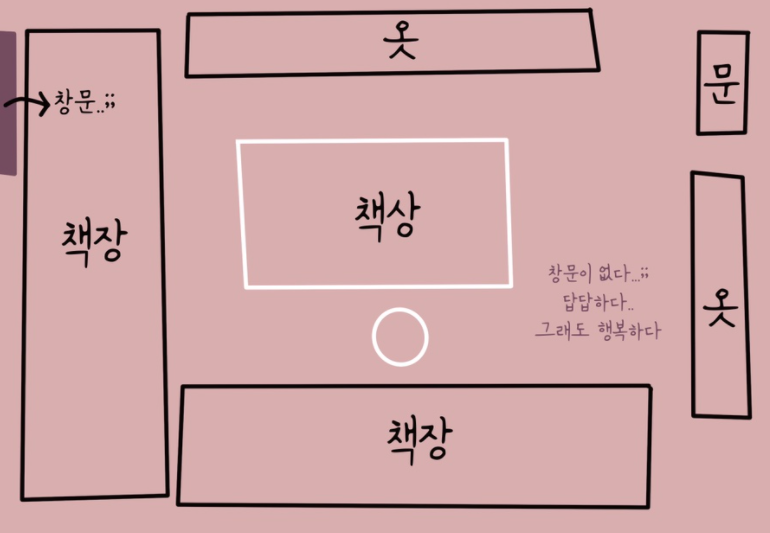 그래서 나는 옷과 책을 조금씩 정리했다. 버리고 한구석으로 몰아넣었다. 방에 딸려있는 작은 베란다를 개조해서 책장을 밖으로 뺐다. 책장을 하나 더 사서 책을 정리했다. 그렇게 작업을 하고 나니 아주 작은 책상과 의자를 놓을 수 있는 공간이 생겼다. 그 공간에 들어가 앉아본다. 비록 창문은 다 막혀있고 모든 벽은 옷과 책으로 가득 차 있지만, 그래도 행복하다. 그렇게 누구나 자기만의 공간이 필요하다.