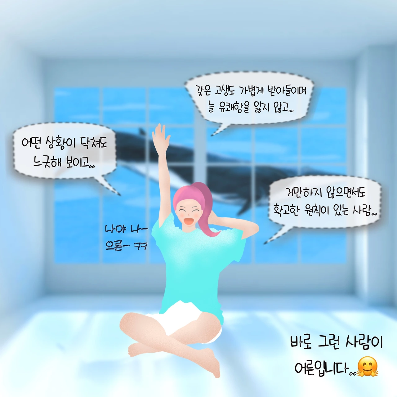 한편 유머는 불완전함, 나약함 같은 처지를 꿰뚫는 통찰이기도 하다. 세상만사가 모두 내 뜻대로 돌아가지는 않는다. 그런 순간에 주저앉아 울기보다는 허허 웃으면서 자신의 처지를 유머로 승화시키는 사람. 그런 사람이 진짜 어른이다.
