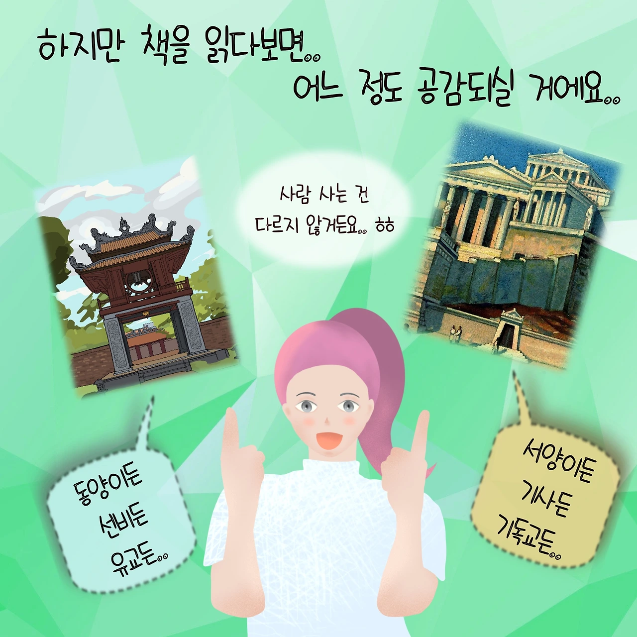 하지만 그 서문을 읽고 나서 다음 페이지들을 펼치면, 글들이 좀 더 매끄럽게 읽히면서 고개를 끄덕끄덕하게 된다. 사실 어른에게 필요한 것은 동양이든 서양이든 기사든 선비든 기독교이든 불교이든 비슷하기 때문이다.