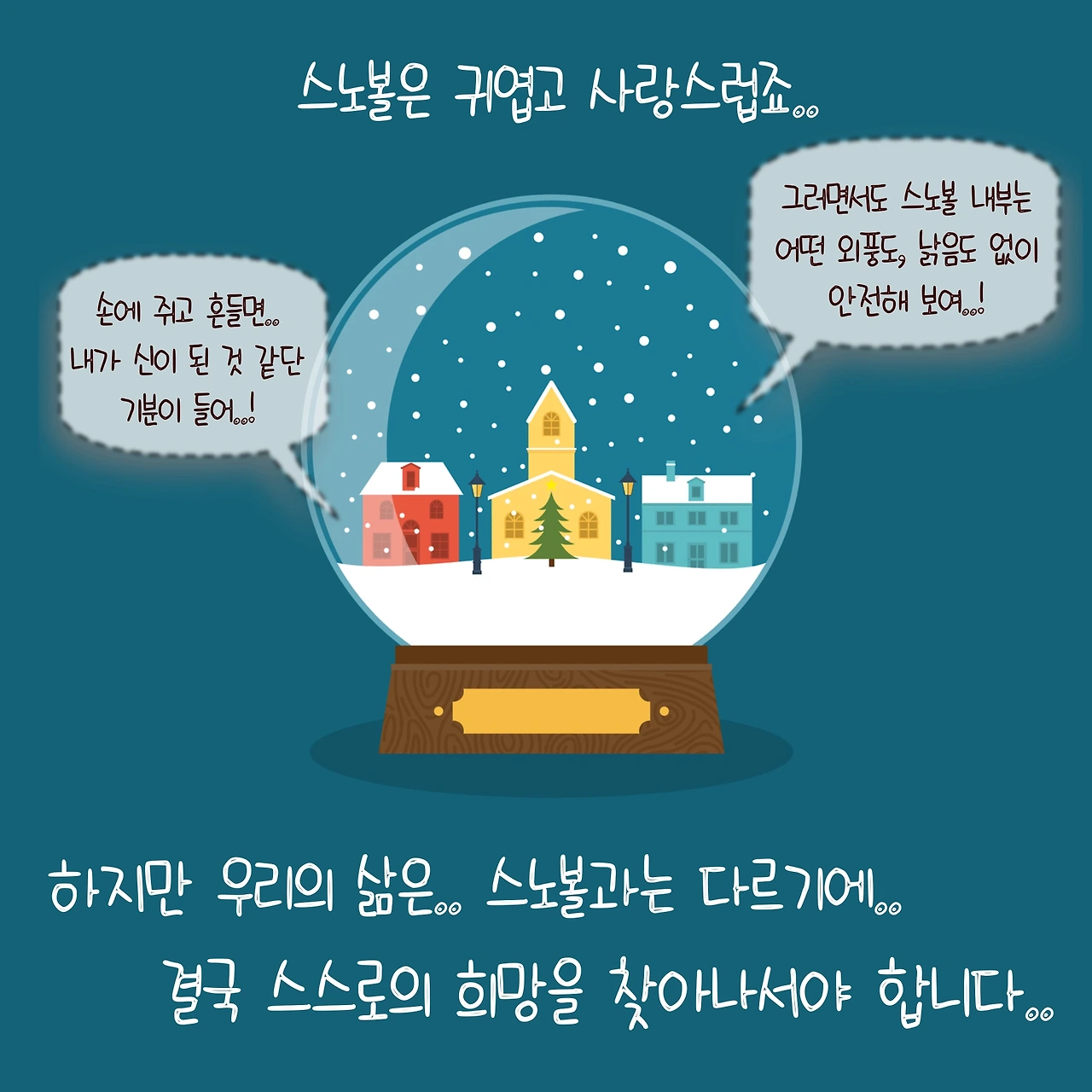 어릴 때부터 그렇게 소녀소녀한 취향은 아니어서, 스노볼이 갖고 싶단 생각은 단 한 번도 해본 적이 없었다. 그러다가 아이를 낳고 나서 얼마 전 남편, 나, 아들과 함께 교보문고의 팬시 코너를 구경할 때였는데 "야. 우리 이거 아들 사줄까?" 하고 남편이 눈앞에서 스노볼을 흔들어댄 적이 있었다.