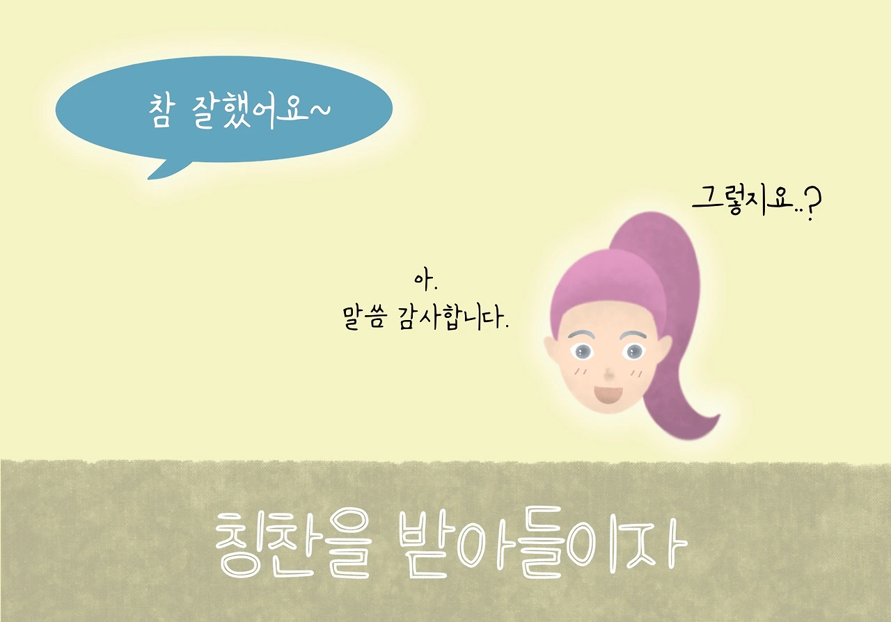 그래서 자존감이 낮은 사람들은 칭찬을 받으면, 반사적으로아니에요! 를 외친다. 저자 허지원 작가는 그런 습관을 당장 버리라고 충고한다. 누군가 칭찬했을 때 자꾸 정색하며 "아니에요" 라고 하면 주위 사람들은 점차 칭찬을 주저하게 된다. 그렇게 칭찬 받는 빈도가 줄어들면, 우리는 어느 순간 또다시 '생각'에 빠져든다. '왜 아무도 나를 칭찬해주지 않지? 나는 정말 쓸모없는 사람인가?'