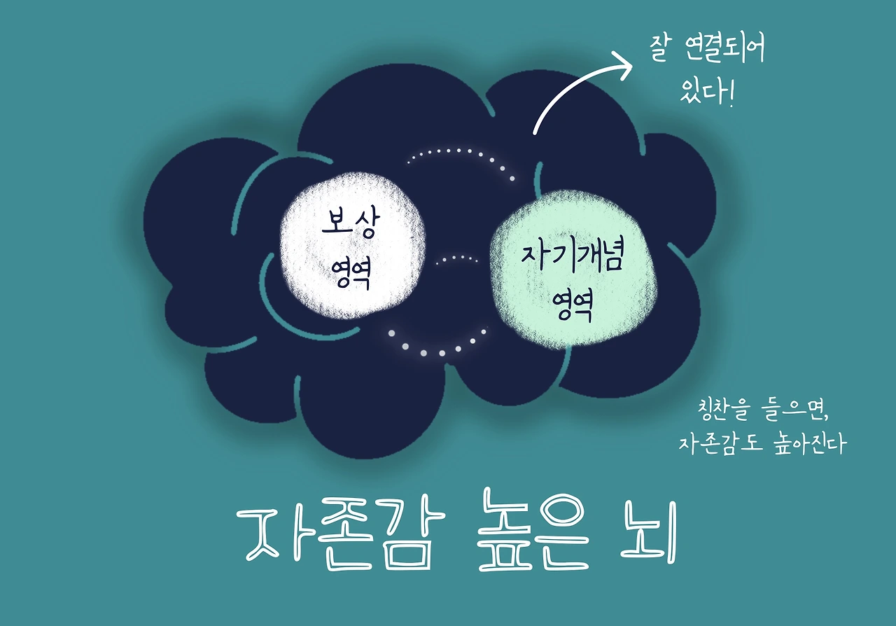 이를 뇌과학적 으로 살펴보면 자존감이 높아진 뇌는, 보상 영역이 자기 개념 영역과 잘 연결되어 있다고 한다. 즉, 칭찬을 들어 즐거워지면, 이것은 뇌의 쾌락영역 뿐 아니라 자신을 평가하는 영역에도 영향을 미칠 수 있다는 것이다.