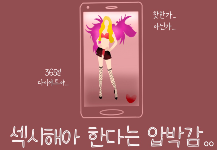 그래서 여자들은 끊임없이 다이어트 압박에 시달리는 걸지도 모르겠다. 여자들 중 자기 몸에 만족하는 사람이 얼마나 있을까. 통계에 따르면, 오히려 날씬한 여성들이 자기 몸을 더 불만족스러워한다고 한다. 끊임없이 자기계발의 압력에 시달리는 것이다. 그렇게 여성들은 자신의 몸과 자아를 평가절하하게 된다. 스트레스다. 매력적인 외모가 이제는 하나의 자기 마케팅이 되어, 우리는 모두 자신을 연출하지 않고는 살 수 없게 되었다.