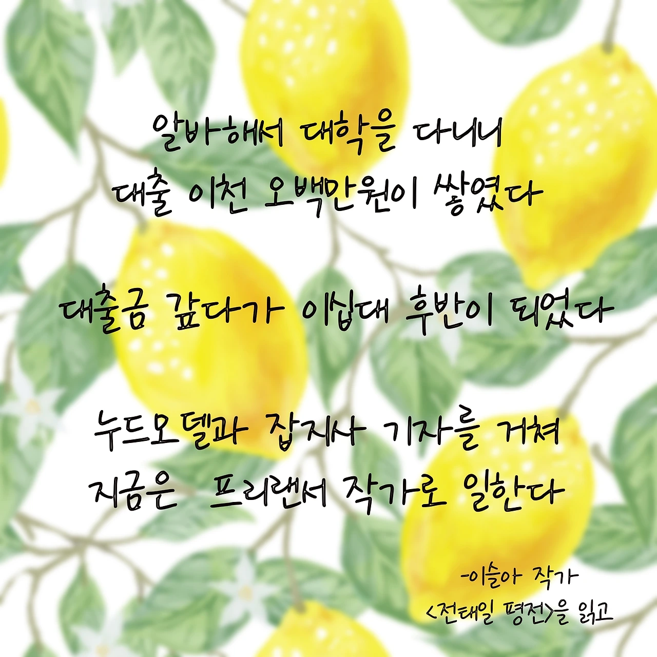 전태일과 이슬아 작가와 나. 어쩌면 공통점이 전혀 없어 보이는 세 사람에 대해 생각해 본다. 우리는 모두 일을 하는 사람들이다. 어떤 노동이든 고단함은 존재한다. 삶을 갉아먹는 것 같은 서걱거림도. 이렇게 일하다 죽지 않을까 하는 허망함도. 하지만 나는 나 자신의 힘듦만 생각했지, 사랑하는 사람, 그리고 타인의 시간까지 선물할 생각은 해보지 못했다. 그저 나 자신의 시간만을 생각하고 아꼈다. 나눌 줄 몰랐다. 그래서 부끄러웠다.