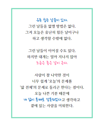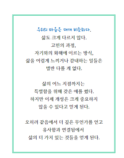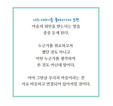 가끔은 누군가의 충고보다는, 비슷한 경험을 가진 사람들의 솔직한 이야기가 더 위로가 된다. 특히 그 이야기가 그 사람의 내면과 진실에 깊이 닿아 있을수록, 더 큰 위로와 공감을 느낀다. 내가 하고 싶은 말을 대신해주는 것 같은 느낌. 그 문제가 해결되지 않아도 좋다. 그저 그런 글만 읽어도 안심이 된다.