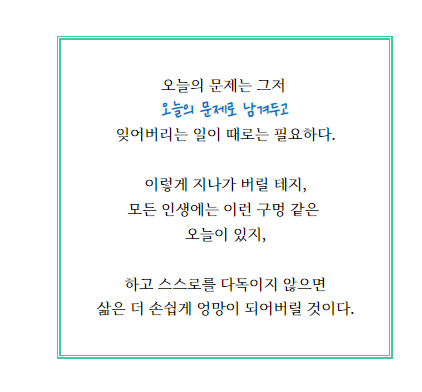 let it be. 순리에 맞게, 그냥 흘러가게 내버려 두자. 불행은, 자신에 대한 의심은 자주 찾아오는 손님이다. 이렇게 왔다가 또 사라진다. 언제나 그렇듯이. 그래서 힘든 날에는 오히려 힘을 빼는 연습이 필요하다. 최선을 다해도 안되는 날이 있다. 잘하려고 노력할수록 더 실수하게 되는 날들도 있다. 하지만 그건 그냥 오늘의 문제다. 내일의 문제도, 내 인생 전체의 문제도 아니다. 그냥 오늘은 운이 없는 날이다.
