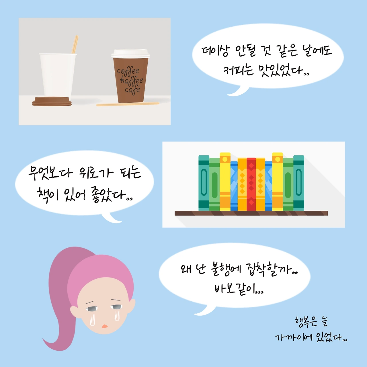 우리는 저마다의 행복과 불행을 가지고 있다. 행복의 이유는 다를 것이고, 그것을 의심할 필요도 없다. 행복한 사람은 자신이 왜 행복한 지 그 이유를 잘 알고 있기 때문이다. 그러니 내 자리로 돌아와, 오늘의 행복을 찾아보자. 행복은 정말 그곳에 한 점 의심도 없이 있을 테니.