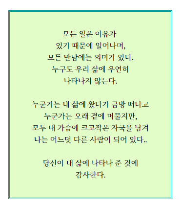 당신이 내 인생에 들어왔다. 나는 당신을 반갑게 맞이하고 싶다. 우리의 만남은 이 커다란 우주에서 축복과 같은 선물이므로. 어쩌면 이러한 만남만큼이나 이별 또한 의미가 있는 걸지도 모른다. 이별이라는 것은, 그 인연이 주는 의미가 끝났다는 것을 의미하기 때문이다.