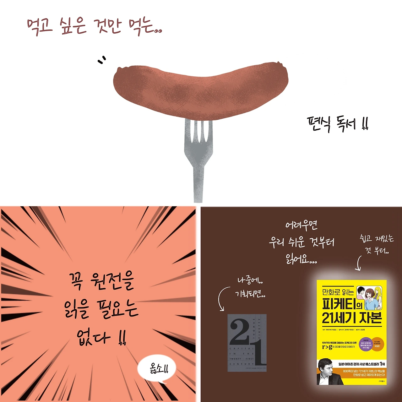 꼭 원전을 읽을 필요는 없다. 피케티의 <21세기 자본>을 읽고 싶은데 어렵다면, <초딩도 읽는 피케티> 또는 <만화 피케티>를 읽어라. 원전을 꾸역꾸역 읽은 사람은 노동만 했을 뿐 아무것도 기억하지 못하지만, <만화 피케티>를 재밌게 읽은 사람은 그중 몇 대목만큼은 기억하고 써먹을 수 있다.