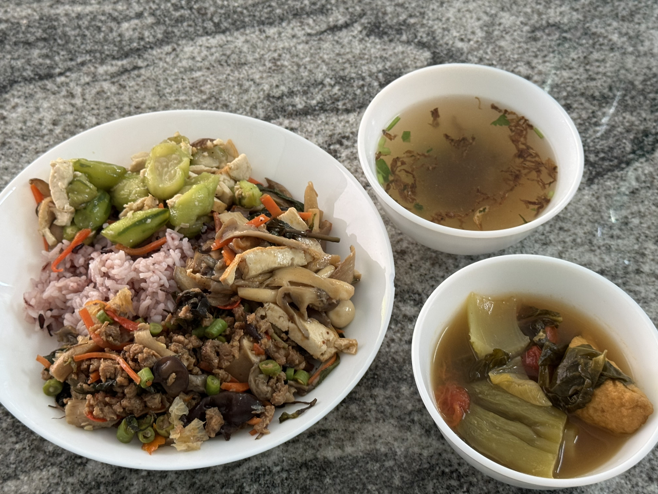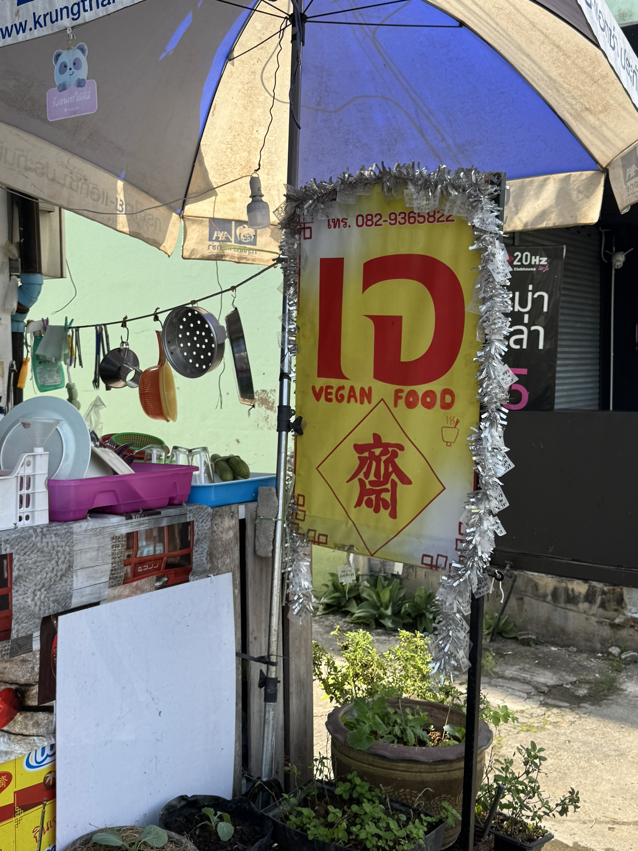 태국의 채식 식당은 노란 배경에 빨간색 글씨로 표시되어 있다. 로컬 식당에는 밥 위에 2-3가지 반찬을 덮밥처럼 올려 먹는 메뉴를 많이 판매하는데 가격이 40바트 정도로 저렴해서 자주 먹었다. 아직도 다 맛보지 못한 반찬들이 많다. 버섯이나 두부, 콩으로 고기 식감을 내서 먹는 재미도 있고 속이 든든하기도 했다.