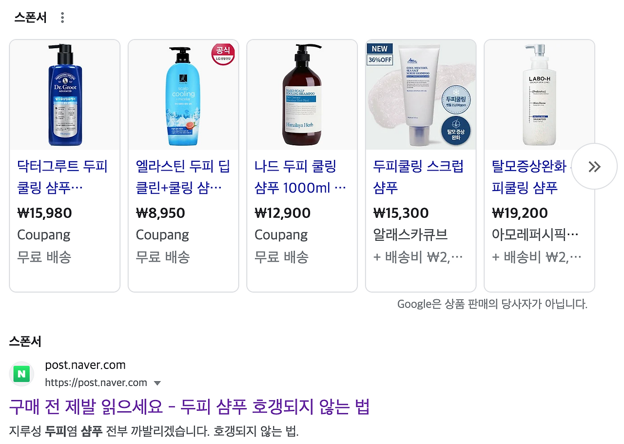 구글링 결과에도 광고(스폰서 표기)가 먼저 등장합니다. 주문 링크 외에 '구매 전 제발 읽으세요'란 링크가 눈에 띄었습니다.