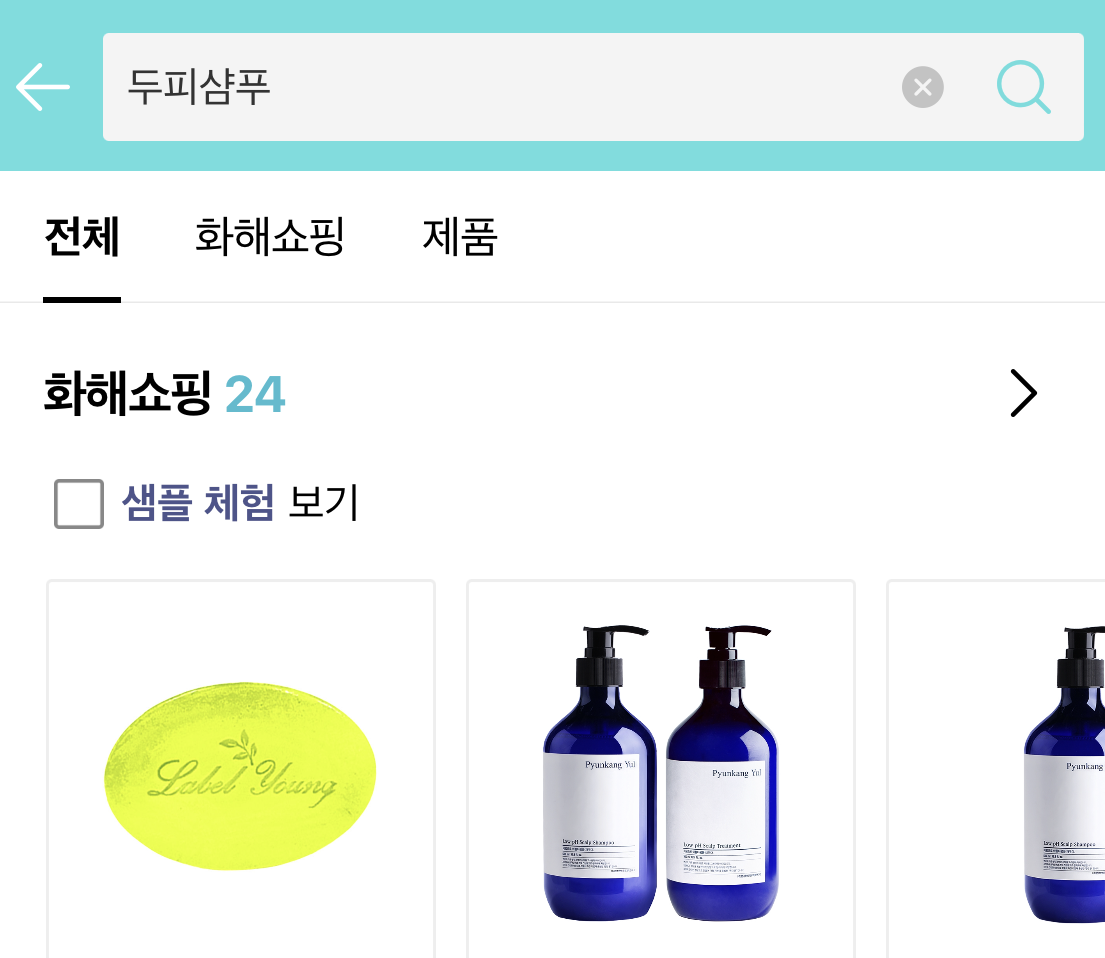 참조한 글들에서 성분 확인이 어려우면 성분확인 어플을 쓰라고 해서 '화해'란 앱의 존재를 알 수 있었습니다. (화장품에는 관심이 없지만) UX에 관심이 많은 저로서는 써 보지 않을 수 없었습니다. 깔고 나서 바로 '두피 샴푸'를 검색했더니 당연하게도 상품들이 등장합니다.