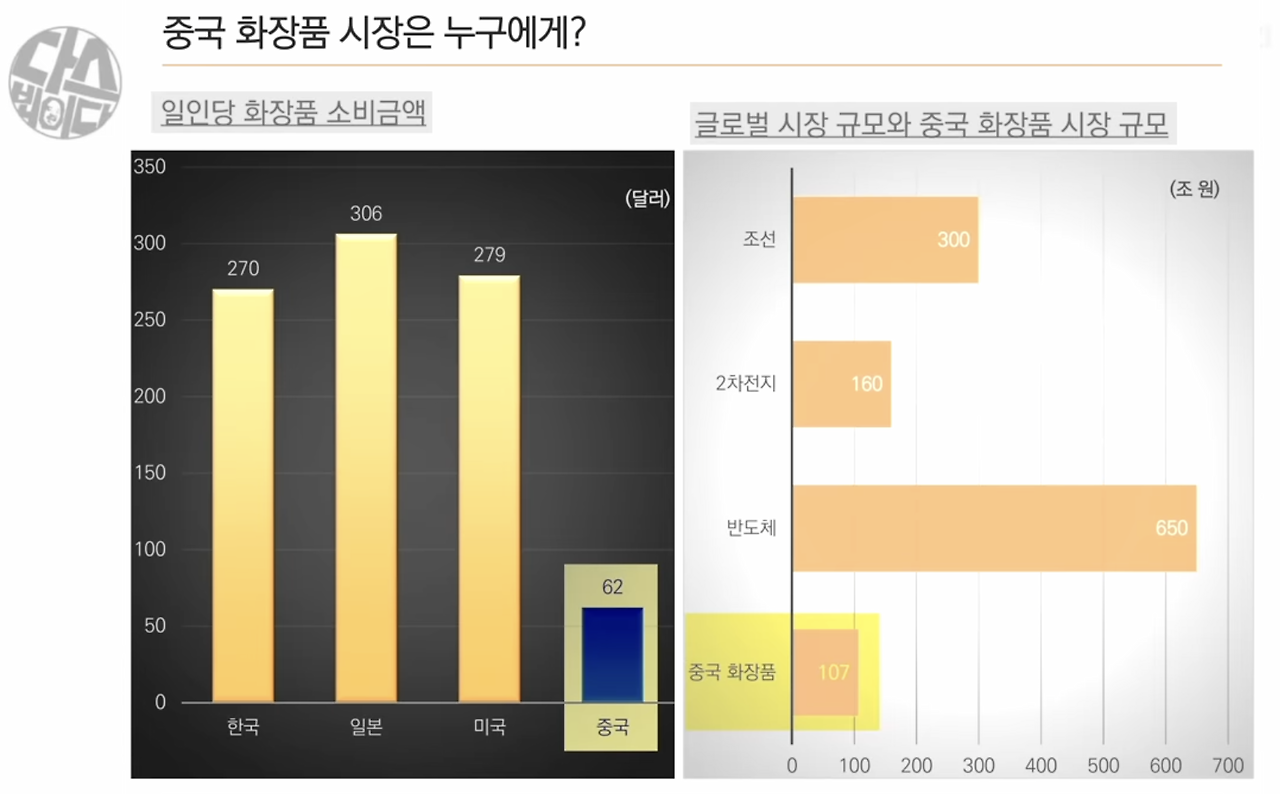 대통령이 탈중국 발언에 이어 대만 관련 발언이 경제에 미치는 영향으로 이광수 님이 주장하는 내용은 일본 시셰이도 화장품의 주가 상승입니다. 아모레의 시가 총액이 빠지는 그래프와 시셰이도 약진은 대통령은 대만 관련 발언 이후 반대 방향을 향하고 있다는 분석입니다. 이전에 어디선가 들었던 내용이라 267회에서 새롭게 인지한 사안은 중국의 화장품 시장은 성장세에 있기 때문에 이후에 '글로벌 조선 시장보다 규모가 커질 수 있다'는 사실이었습니다.
