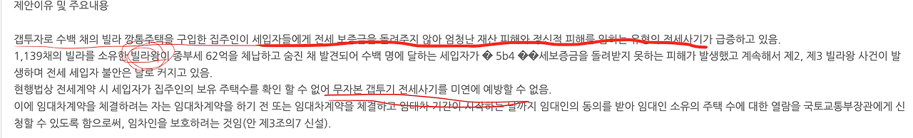 이광수 님이 설명한 임대차 보호법 개정안이 정확히 언제 진행한 어떤 법안인지는 모르겠지만 구글링 해보니 국회 페이지가 나타났습니다. 제안 이유를 보니 '전세 사기' 방지를 목적으로 함이 분명하게 드러납니다.