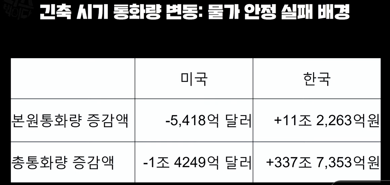 최 교수님 주장에서 제가 분명하게 '아하'할 수 있던 장면은 금리를 올리고 있는 미국과 우리의 통화량 증감을 비교한 표입니다. 이 표야 말로 사태의 저변에 있는 정책적 실패를 보여줄 수 있는 확실한 팩트가 아닌가 싶었습니다.