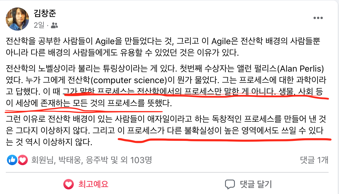 하지만, 그보다는 최근에 김창준 님이 쓰신 글을 인용하는 편이 제가 느낀 영감을 표현하기에 더 효과적일 듯합니다.