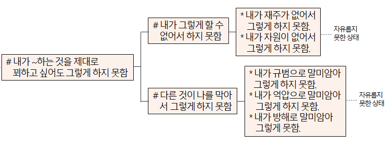 앞서 봤던 최봉영 선생님의 도식에서 '쪽인 나의 꾀함' 하위에 자유롭지 못한 상태가 바로 이를 묘사한 것이라 할 수 있습니다.