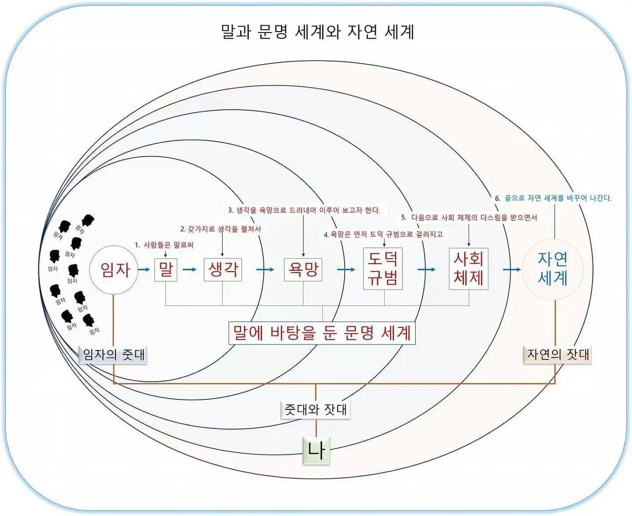 사람은 말로 생각을 펼쳐서 욕망의 임자로 자리하게 되면, <내>가 누구인지, <내>가 <나>로서 <나>를 위하는 것이 무엇인지, <내>가 <나>로서 <나>를 위하려는 뜻에서 <내>가 어떤 일을 어떻게 해야 하는지 매우 또렷이 알 수 있게 된다. 이때부터 사람들은 저마다 <내>가 <나>로서 <나>를 위하는 <나>의 삶을 살아가게 된다. 이런 까닭으로 사람들은 욕망의 임자가 또렷해질수록 <내>가 <나>로서 <나>를 위하는 <나>의 삶을 살아가는 일에 더 많은 힘을 쏟게 된다.