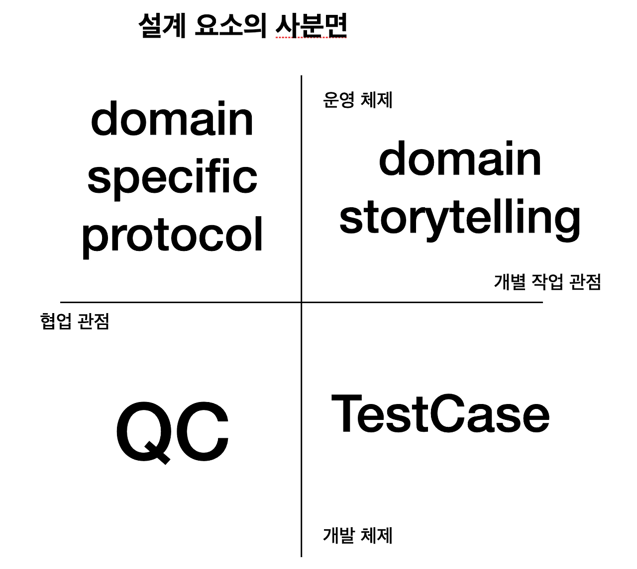 우리의 맥락에서 위에 설명한 요소가 '설계'의 전부인지를 따져 보았습니다. 그간 경험으로 두 가지가 떠올랐습니다. 하나는 '도메인 스토리텔링'이라는 용어로 묶어서 살펴보았던 업무 규칙의 공유 방법입니다. 가장 효과적인 것은 구두로 하는 일이지만, 이미 자산화된 이후에도 계속 구두로 할 수는 없기에 어떤 형태 혹은 어떤 조합(코드와 문서)이 최적인지 알고 싶은 욕망이 있습니다.[1]
