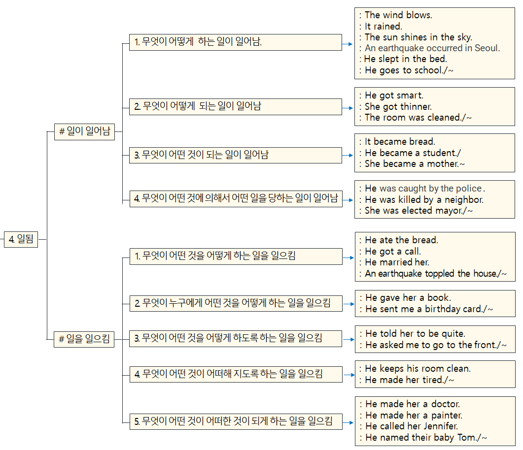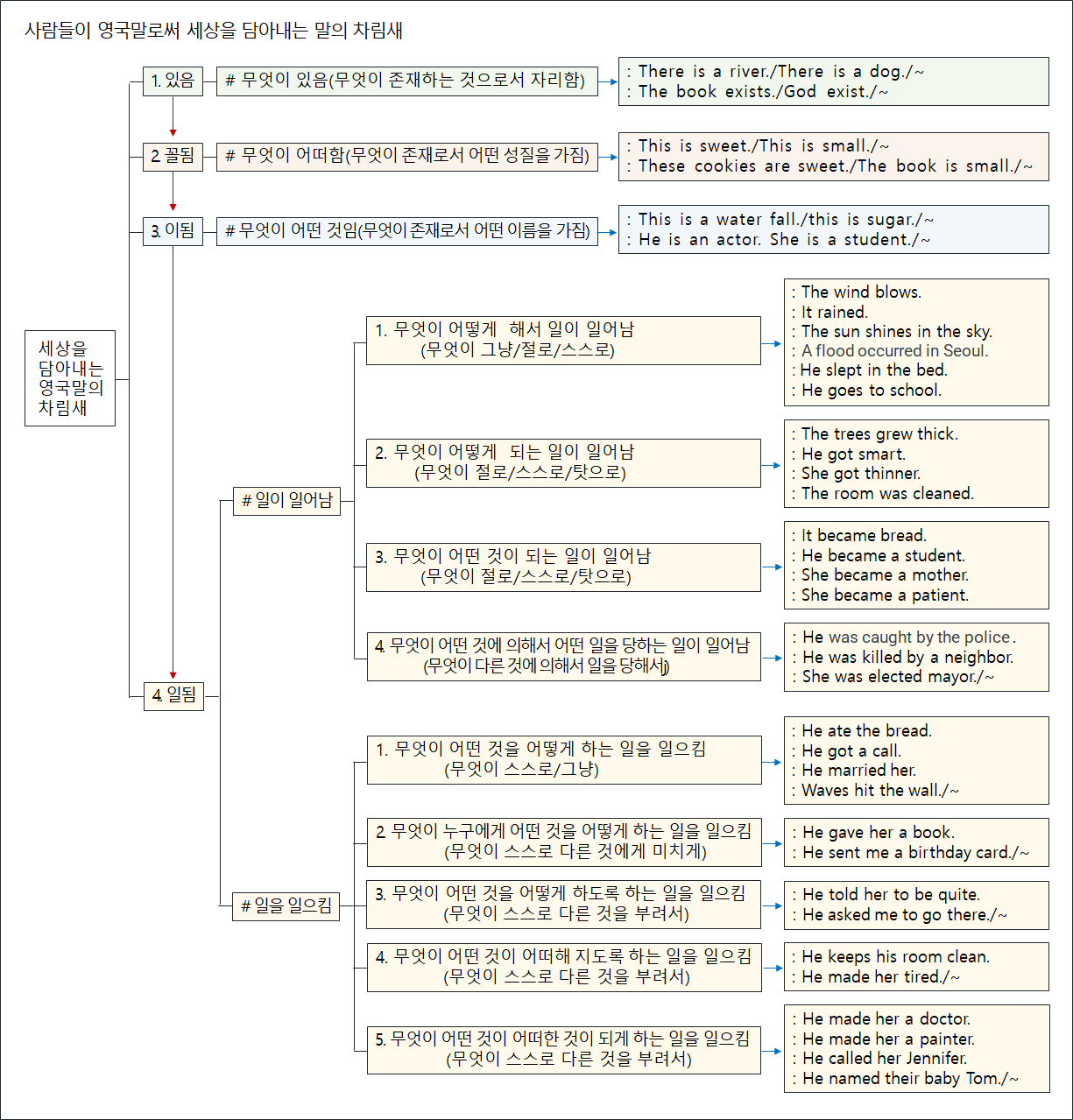도식을 <사람들이 한국말로써 세상을 담아내는 방식>과 비교해 보면 '됨이' 부분이 빠져 있습니다. '있음'부터 시작하는 것과 이 현상을 묶어서 영국말에는 '온이 나'만 있고 '쪽인 나' 사고법이 빠져 있다고 추측할 수 있습니다. 이에 관해 최봉영 선생님께 통화로 여쭤 보았는데, 선생님은 성경의 창세기에 무에서 무언가 탄생하는 식의 표현이 영국말에 담긴 '온인 나' 사고의 전형으로 설명하셨습니다.