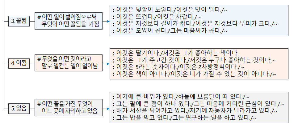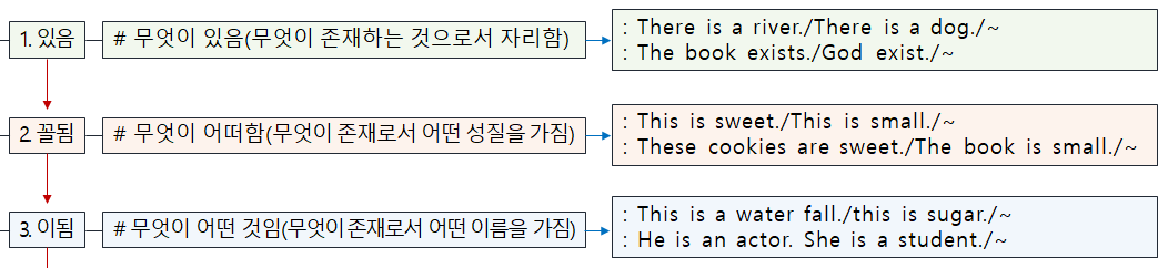 한국말의 경우 '됨이'로 인식한 후에 '일됨', '꼴됨', '이됨', '있음'으로 펼쳐지는데 반해, '있음'으로 시작해서 '꼴됨', '이됨', '일됨'으로 펼쳐집니다.