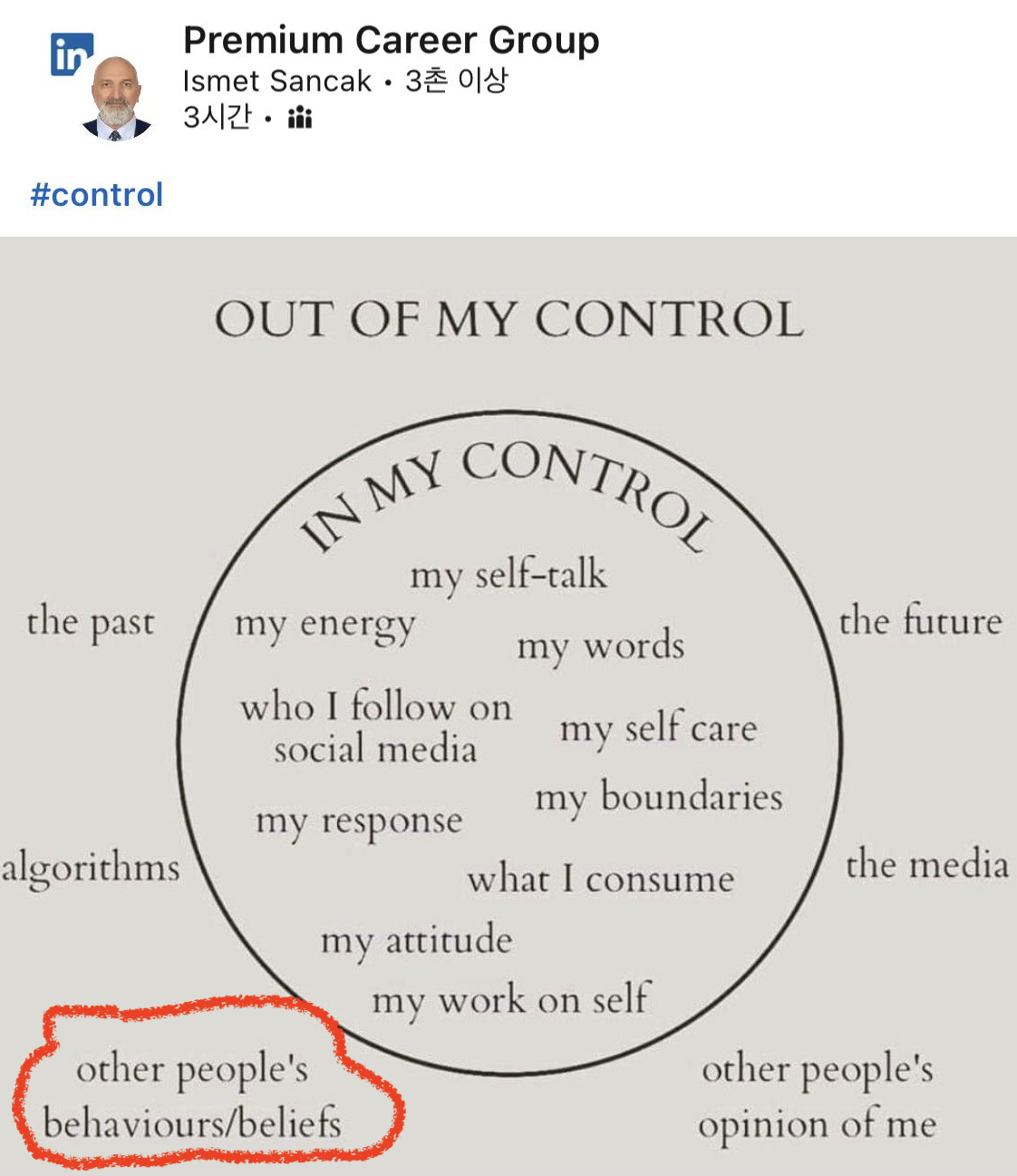 마지막으로 함께 연상되는 과거의 경험과 기록을 소환합니다. 가장 먼저 <나의 바운더리를 튼튼하게 하는 이분법>을 쓸 때가 떠오릅니다. 아래 그림은 통제 밖의 요인에 대해 생각하며 감정을 소모한 시간들을 잘 표현해 줍니다.