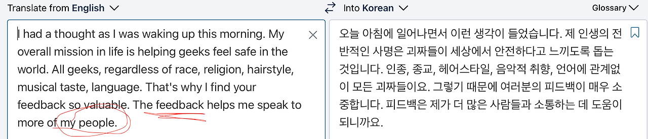 특히 'my people'이라는 표현은 앞서 느낀 '관계'에 대해 비슷한 맥락을 전제한 듯하기 때문입니다. 또한, 그가 말한 피드백(feedback)이 효과적으로 작용하려면 경청하는 상대가 반드시 필요하다는 인식을 하게 해 주기 때문입니다.