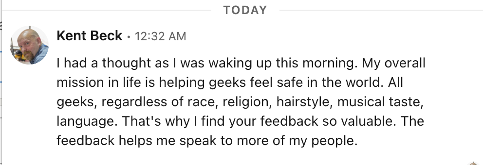 여기에 더하여 글을 쓰고 있는 현재 링크드인으로 받은 Kent Beck의 메시지는 제 생각을 더 풍부하게 합니다.