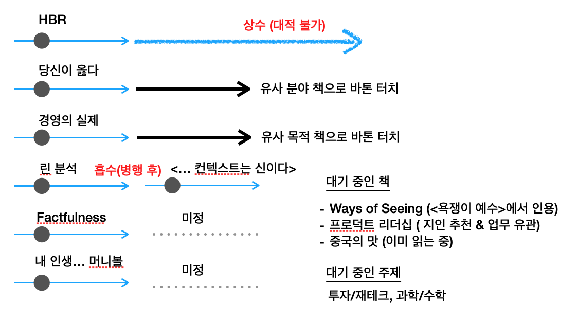 <경영자는 기업이라는 유기체를 관리한다> 이후 무려 4개월 만에 <경영의 실제> 읽기를 이어가려고 하는데 과거 맥락이 바로 살아나지 않습니다. '병렬 독서'를 즐기는 습관이 지닌 맹점은 여러 권을 동시에 읽을 때 우선순위가 밀리는 책은 사실상 한동안 읽지 않아 잊히는 문제가 있습니다.