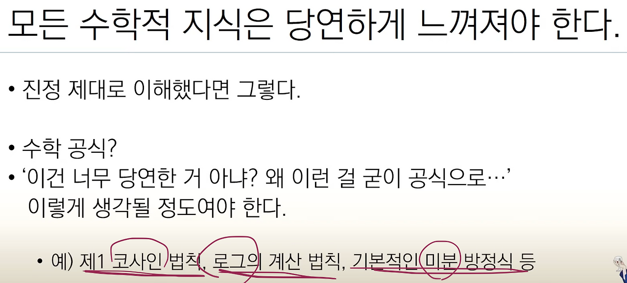 내가 수포자였음을 다시 확인하는 내용이 등장합니다. 예에 등장하는 공식들에 대해 저는 당연하다고 느껴본 일이 없으니까요. 당연하게 느껴지지 않으면 수학을 이해한 것이 아니라 암기한 것이라고 합니다. 탁월한 설명이란 느낌이 듭니다.