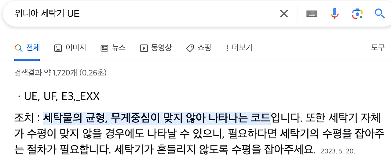 평소 빨래를 널 때는 두 팔로 힘 있게 탁 털고 널게 됩니다. 이유는 잘 모르지만, 어머니 보고 따라 하는 듯도 하고요. 암튼 늘 그렇듯이 행동하는데 수건에서 물이 심하게 튀었습니다. 탈수가 안된 것인가 싶었습니다. 세탁기를 확인해 보니 UE라고 쓰여 있었습니다. 세탁기에 설명이 붙어 있나 찾았지만 그런 것은 없었습니다. 평소 라면도 봉지에 붙은 조리법을 보고 끓이는 저라 표면의 설명을 찾기 좋아합니다.
