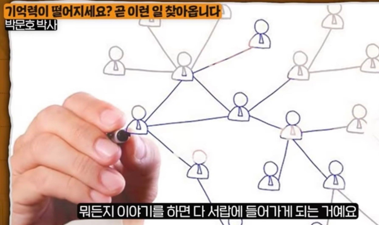 영상에서 6분 38초에 다음 장면이 등장합니다. 어떤 사실을 단독으로 기억하는 일은 어렵기 때문에 관련된 기억 3가지를 연결해서 기억하라고 합니다.