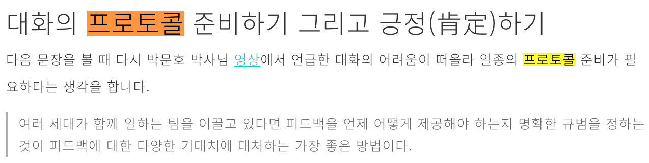 그중에 핵심 개념은 '프로토콜'인데, 당장 써먹을 수 있는 방법은 대화 상대와 사실과 의견을 나누자고 사전에 선포하고, (감정이 막 올라오더라도) 각자 서로 알고 있는 사실만 확인하는 과정을 먼저 거치면 대화가 나아질 수 있다고 합니다. 저도 기회가 되면 바로 활용해 보려고 합니다.