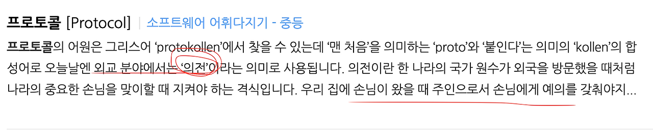 아쉬움은 네이버 지식백과에서 채울 수 있었습니다. 먼저 뉴스에서 종종 들을 수 있는 의전을 뜻하는 영어가 프로토콜입니다.