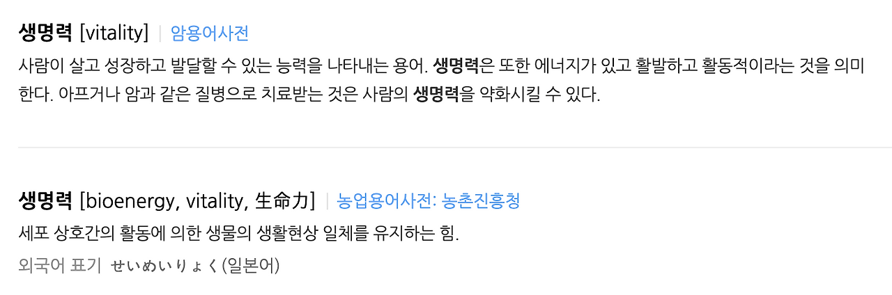 선생님의 설명을 듣고 깨달은 바는 갖가지 살리는 힘에서 '문장놀이'에 이르는 가운데 중요한 특징을 하나 빠트렸다는 사실입니다. 우선 살리는 힘이라고 말하면, 우리가 가진 생명력과 자연이 우리에게 주는 혹은 우리가 가공한 외부의 에너지를 떠올릴 수 있습니다. 백과사전을 찾아보니 헛다리를 짚은 것인데 상식적 개념이라 생각했던 생명력은 지엽적인 사전에서만 볼 수 있었습니다.[1]