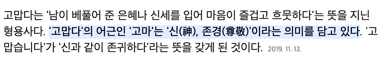 그리고 그 고마움은 그냥 생기는 것이 아니라 느끼려고 노력해야 하는 일이라고 합니다. 일단, 여기서 우리말 어원을 처음 들었습니다. '고마경', '고마하다' 등을 말씀하셨는데, 고마경을 찾아보니 '고마'는 '‘공경’의 옛말'이라고 하고, 敬을 '고마 경'이라고 했던 듯합니다. 그리고 '고마하다'의 어원을 '‘공경하다’의 옛말'로 풀이하는 기록이 있었고, '고맙다 어원'을 키워드로 구글링 하면 다음 풀이가 나옵니다.