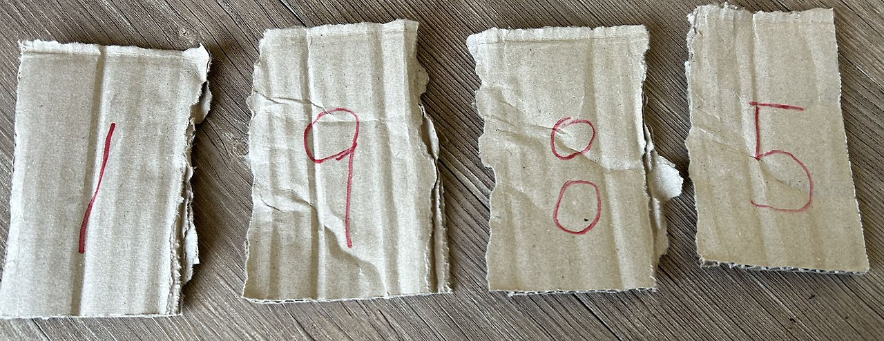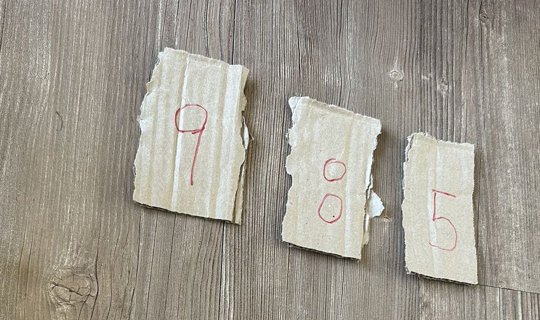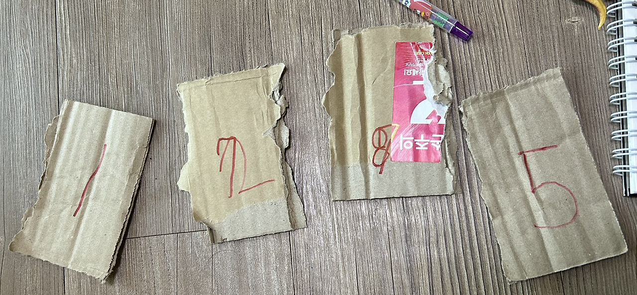 그때, 불현듯 <아이에게 직관적으로 식(式)을 느끼게 하기>와 비슷하게 수학적 개념을 체득할 수 있다는 생각에 재활용 상자에 있던 박스를 뜯어 숫자를 썼습니다.