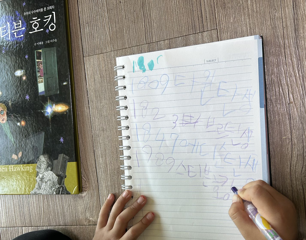 그리고 생각지 못한 효과가 하나 더 있습니다. 눈에 보이는 도구를 활용했더니 재미있어 보였는지 큰 아이도 달려들었습니다.
