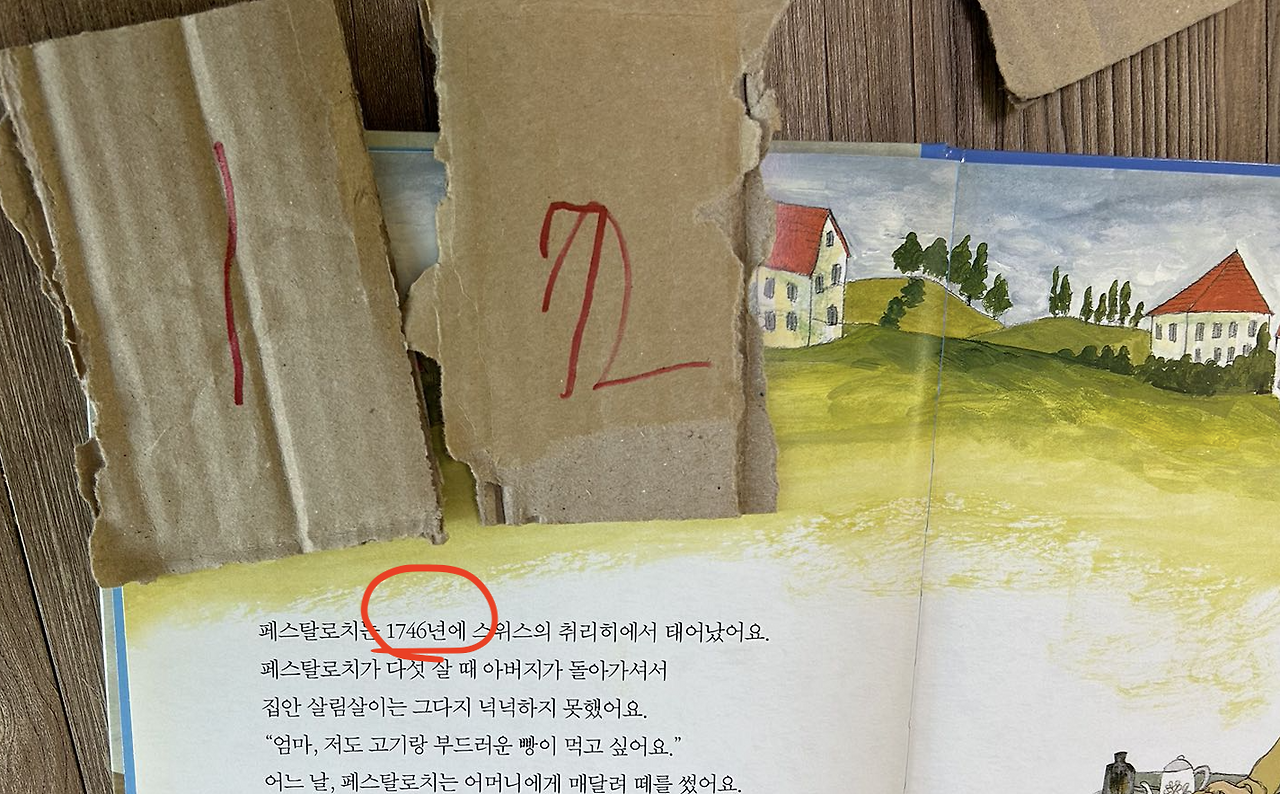 둘째는 아직 모르는 것이라고 제가 개입해서 둘째의 민망함이 오래 유지되기 않게 하고 다른 색깔 책도 뽑자고 하는데, 한참 만에 페스탈로치가 우리를 구원했습니다.
