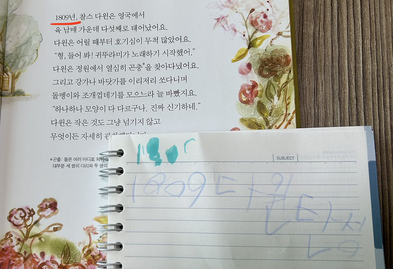 첫 번째 책은 다윈이었습니다. 박문호 박사님 말씀대로 모든 위인전은 앞 쪽에 태어나는 일을 다룹니다. 더불어 아이에게 '탄생'이라는 단어를 익히게 합니다.