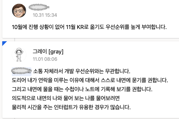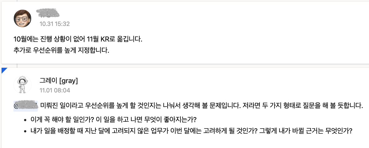이전 글에서 언급한 대로 회사에서 OKR을 적용하고 있습니다. 팀 OKR 이기 때문에 월별 KR의 경우 달성을 못한 업무를 그대로 순연하는 경우가 발생합니다.