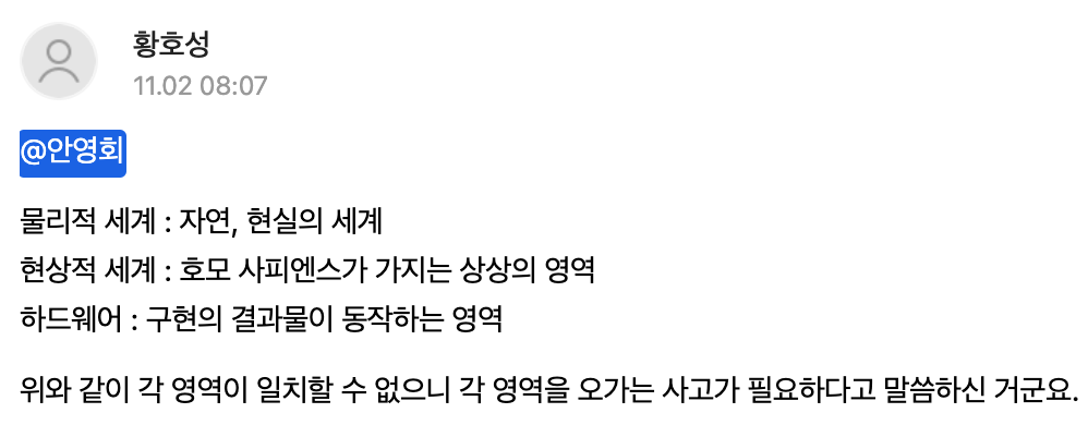 그런데 저 그림을 그릴 때에는 현실과 컴퓨터 세상 둘의 대칭이었는데, 후배의 질문에 의해 중간에 설계라는 협을 두니 훨씬 더 복잡한 일이란 인식을 하게 된 것이기도 합니다.