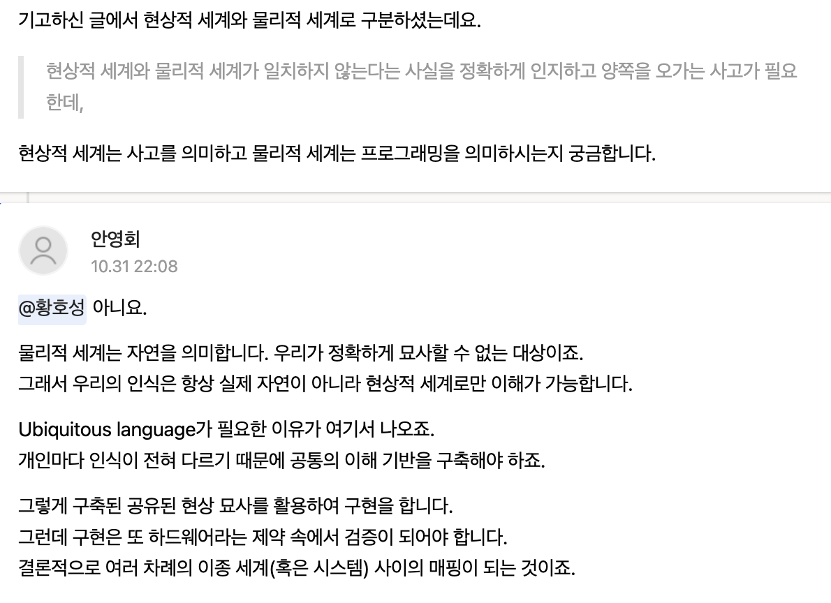 <후배 덕분에 한 번 더 생각하는 객체 지향>은 다음의 댓글 대화로 마무리했습니다.