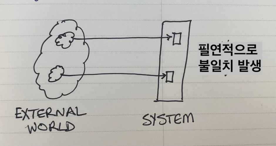 바로 External world가 현실 세계라면 시스템은 하드웨어의 제한을 받는 또 다른 체계(혹은 세계)이고 프로그램은 이들 사이의 매핑에 대한 문제입니다. 여기서 설계라고 하면 각자 다른 현상 세계를 지닌 사람들의 협업 위에서 수행하는 아슬아슬한 협업이란 인식이 생긴 것입니다.